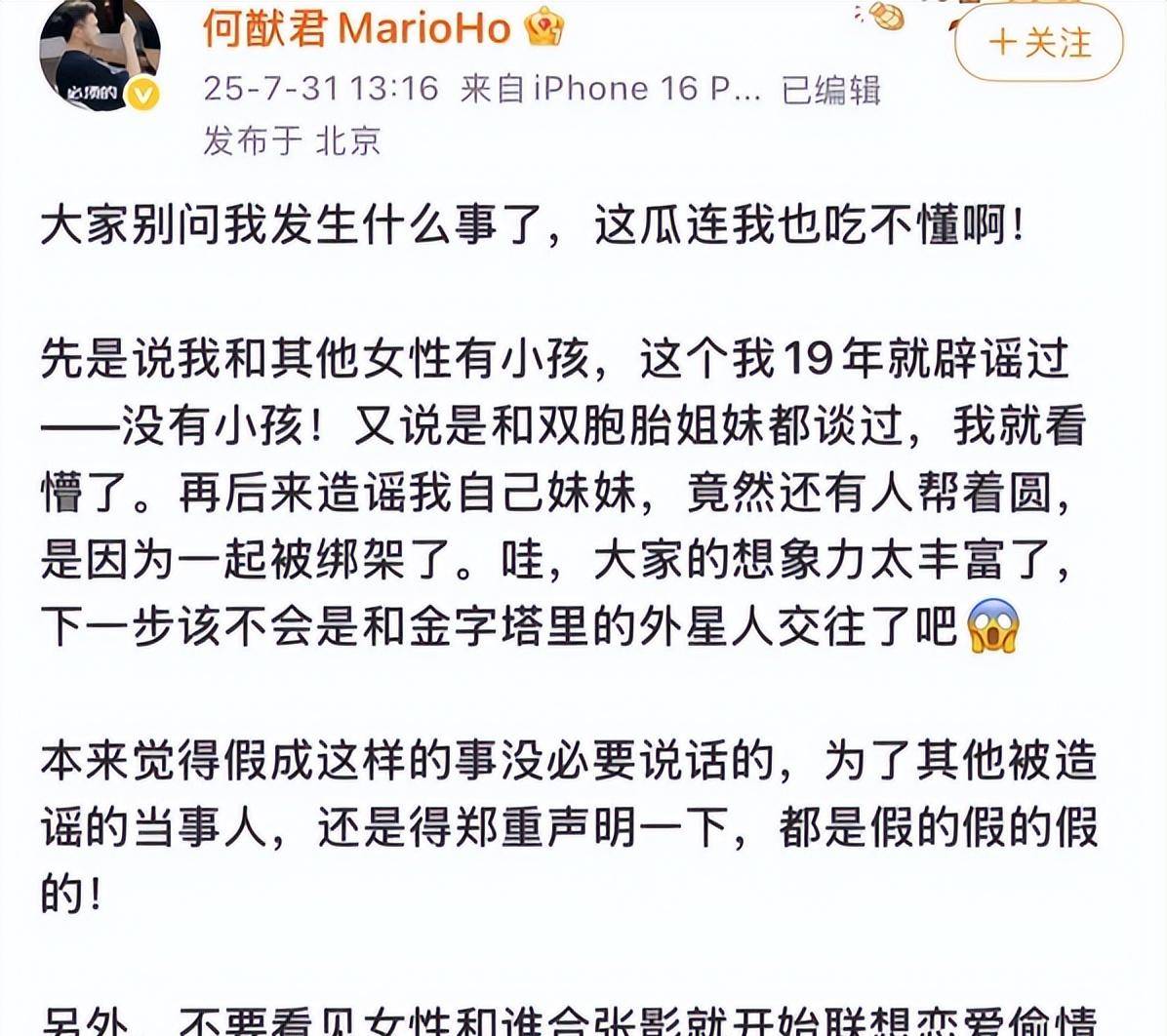 民众能够还记得,本年1月,一条陡然冒出来的爆料让搜集炸了锅。有账号五个字就把何猷君推优势口浪尖,说他“出轨了”,没证据但字字扎心。更怪异的是,何猷君这回相当安静,没第偶然间出头还击。要大白2025年那次“私生子”听说,他分分钟连发三条“假的”怒怼终究。
